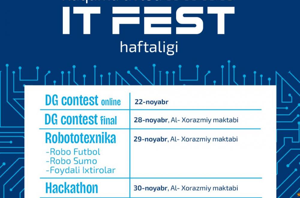 Yurtimizda IT sohasiga qiziqqan barcha yoshlarni an’anaviy Raqamli Avlod IT Fest haftaligiga taklif qilamiz!