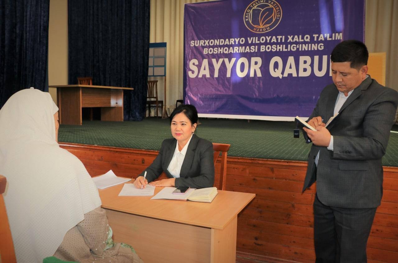 Buxoro viloyati boshqarma boshlig‘i Dilfuza Mustafoyeva, Navoiy viloyati boshqarma boshlig‘i Marat Shomuratov, Surxondaryo viloyati boshqarma boshlig‘i Suluv Hamidova ishtirokidagi qabullar davomida xalq ta’limi sohasida to‘planib qolgan muammolar, pedagoglarni ish bilan ta’minlash borasidagi savollar tinglandi. Fuqarolar o‘zlarini qiziqtirgan barcha savollariga javob oldi.