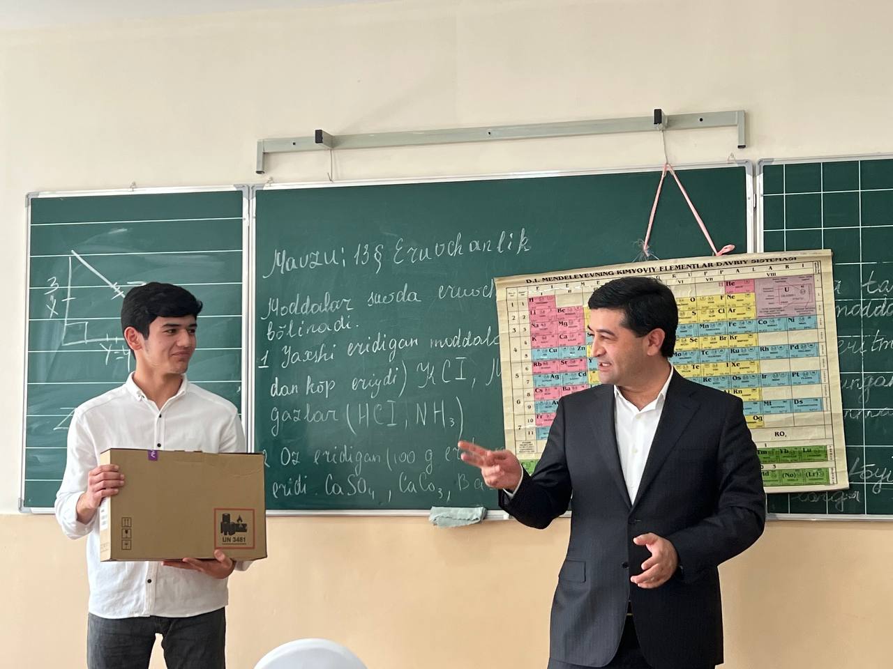 Maktabdagi 11-“A” sinf o‘quvchilarining yakunlanayotgan kimyo darsi vazir bilan muloqotga ulanib ketdi. O‘quvchilar bilan suhbat chog‘ida ularning fanlarga oid bilimlari, qiziqishlari hamda kelgusi rejalari haqida so‘z bordi.