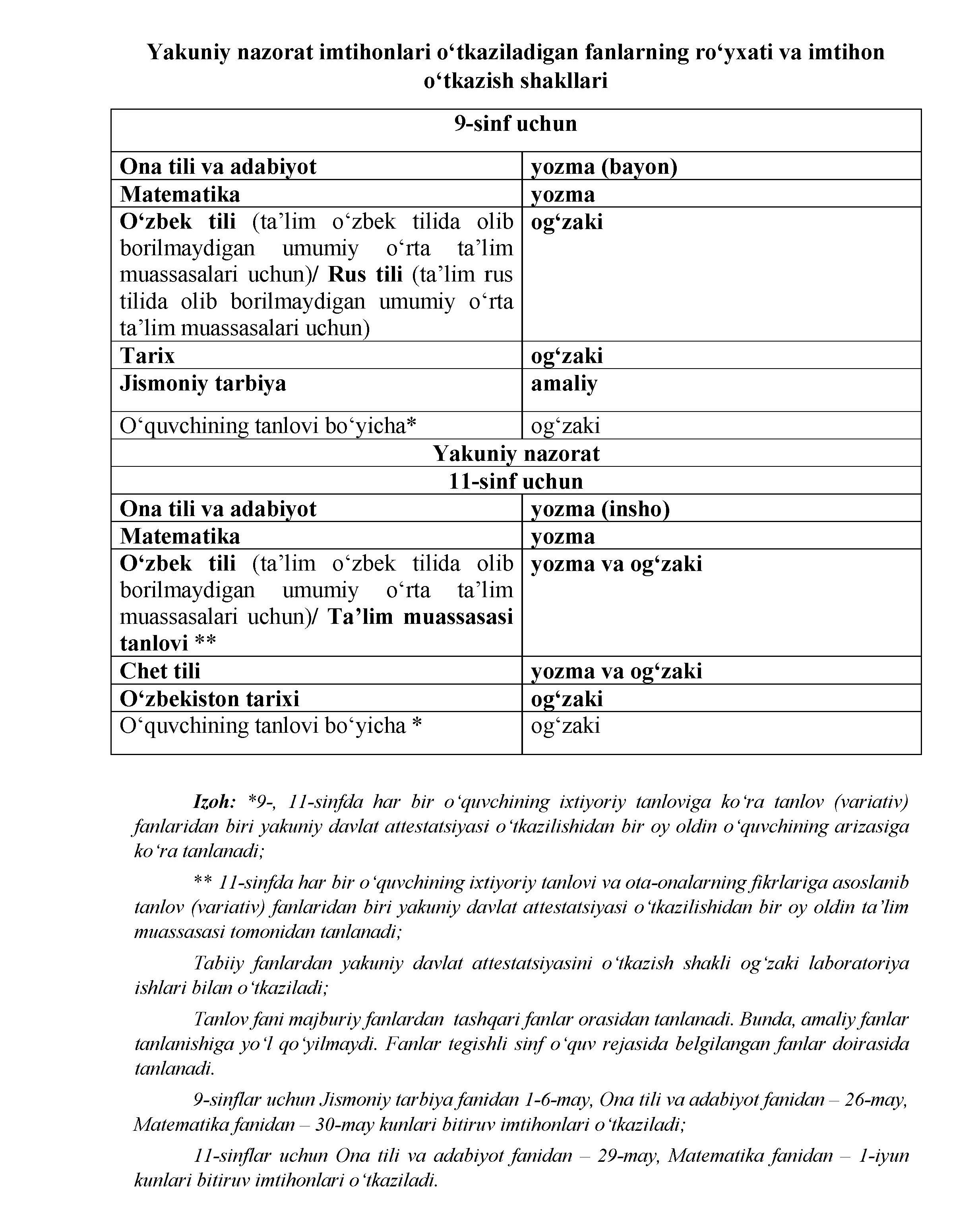Shuningdek, 9- va 11-sinflar uchun yakuniy (bitiruv) nazorat imtihonlari joriy yilning 26-mayidan 15-iyuniga qadar tashkil etiladi.